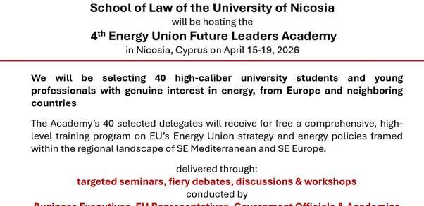 The Greek Energy Forum and the School of Law of the University of Nicosia are co-organizing the 4th Energy Union Future Leaders Academy within the regional landscape of Eastern Mediterranean and South-eastern Europe.
